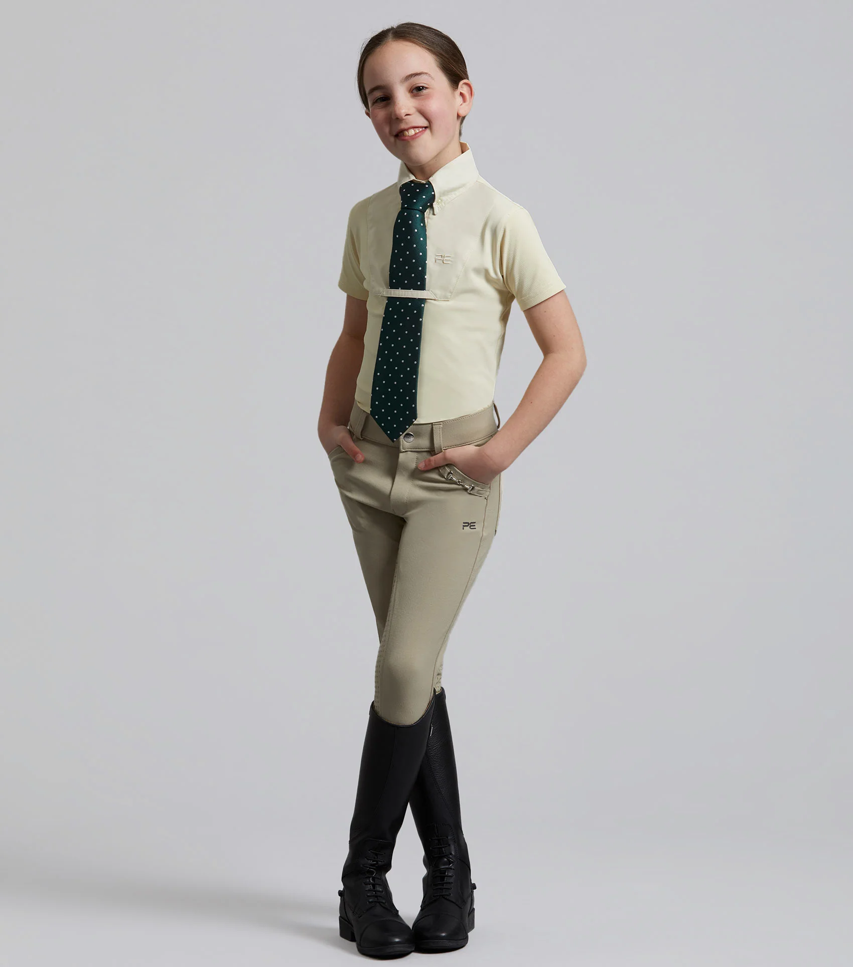 Featuring large traditional front pockets which are embellished with a modest snaffle link detailing the edge and subtle PE branding. The added back pocket design offers a functional, competition aesthetic for show days.