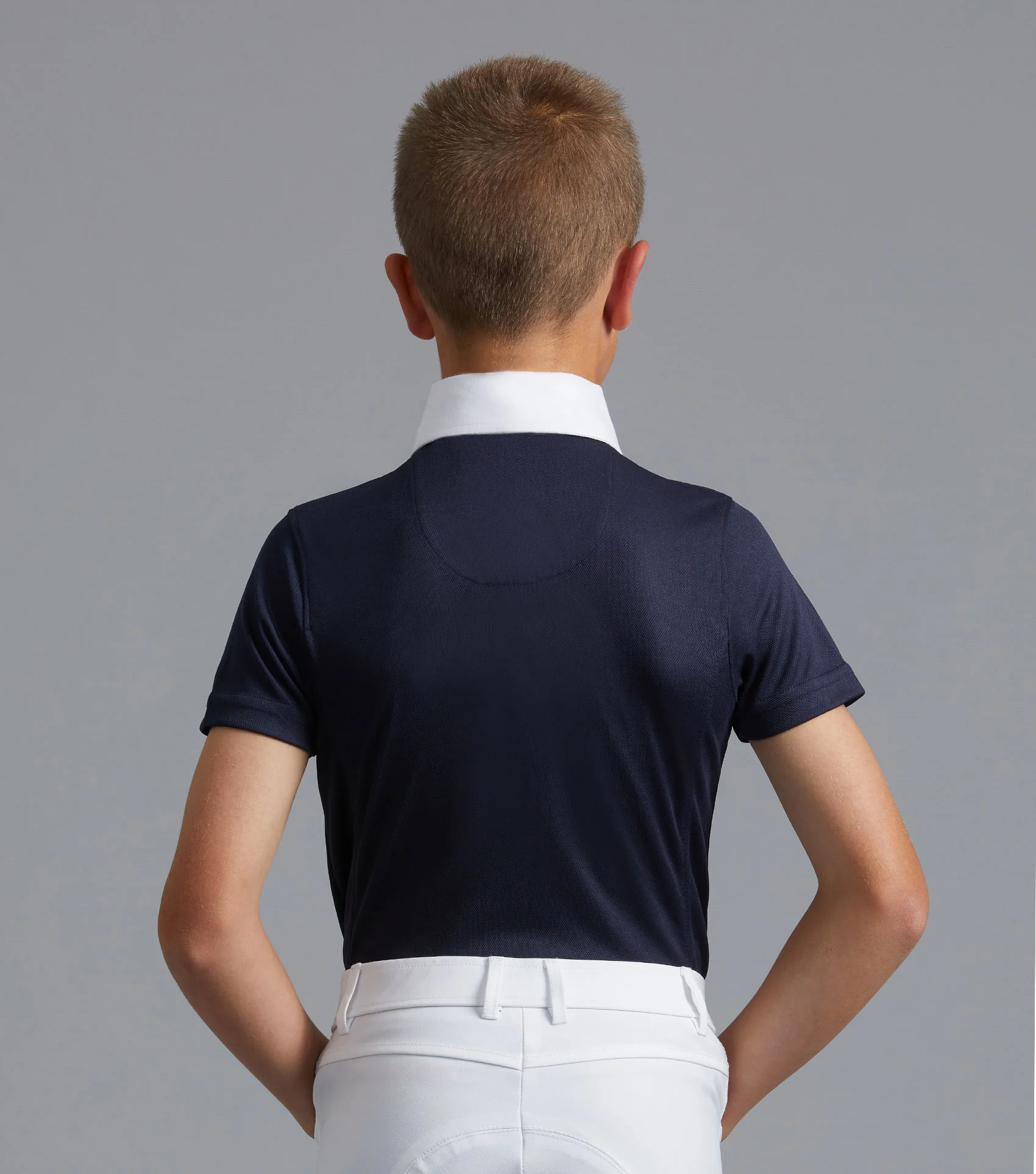 A sophisticated boy's competition show shirt engineered with technical 4-way stretch pique jersey which boasts high breathability and moisture wicking properties, ideal for keeping cool and comfortable in the show ring.Â